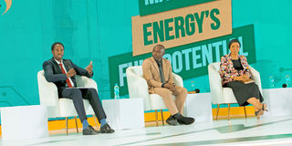 Vice president of AngloGold Ashanti-GGML responsible for sustainable projects in Ghana and Tanzania Simon Shayo (left) speaks during a forum to discuss energy issues on Monday. Others include chairperson of Tanzania Renewable Energy Association (Tarea), Mr Prosper Magali (center) and founder and managing director of Lindam Group Limited, Ms Zuhura Muro. PHOTO | CITIZEN CORRESPONDENT