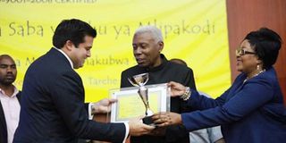The managing director of Vodacom Tanzania, Mr Rene Meza (left), receives from Vice-President Dr Mohamed Gharib Bilal and the deputy minister for Finance, Ms Janeth Mbene, a trophy and a certificate the firm was awarded after emerging the third best National Tax Contributor during the climax of the Taxpayers’ Day on Friday in Dar es Salaam. Photo/Silvan Kiwale