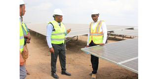Commissioner for Electricity and Renewable Energy at the Ministry of Energy, Mr Innocent Luoga (centre), tours the Ngunga solar power project in Kishapu District. On the right is the project manager, Emmanuel Mbando. PHOTO | STELLA IBENGWE