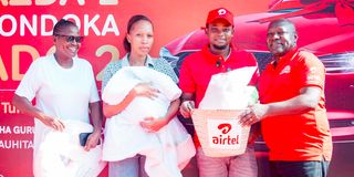 Director of Airtel Money Andrew Lugamba (right), presents a gift basket to the grand prize winner of a Mazda CX-5, Shakuu Joshua (second right), and his family during a handover ceremony. Looking on are the winner's mother, Magreth Mtei (left), and his wife, Victoria Jeremiah who holds their newborn baby. PHOTO | COURTESY
