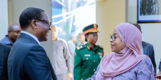 President Samia Suluhu Hassan welcomes Special Envoy of the Commonwealth Lazarus Chakwera at State House in Dar es Salaam on April 15. PHOTO | STATE HOUSE
