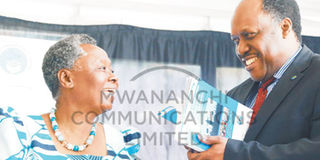 Registrar of Political Parties Judge Francis Mtungi shares views with the Legal and Human Rights Centre executive director, Dr Helen Kijo-Bisimba, in Dar es Salaam yesterday shortly after he launched the Observation Report on the 2015 General Election. PHOTO | ANTHONY SIAME