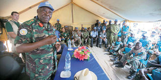 The acting Force Commander, Lieutenant General Paul Ignace Mella from Tanzania, addresses troops based in Khor Abeche, South Darfur, after Saturday’s ambush that killed seven African Union-United Nations Mission peacekeepers and wounded 17 others. PHOTO | UNAMID