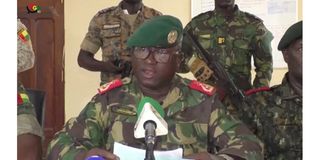 Dinis N'Tchama, spokesperson for Guinea-Bissau's High Military Command, delivers a speech in Bissau, Guinea-Bissau, November 26, 2025, in this screengrab from video.