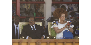 Cameroon's 92-year-old President Paul Biya, who is seeking an eighth term, sits with his wife Chantal Biya during the launch of his electoral campaign, in Maroua, Cameroon, October 7, 2025.