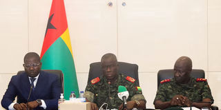 From L-R, Guinea-Bissau's Prime Minister Ilidio Vieira Te, transitional president Major-General Horta Inta-a and Major-General Tomas Djassi, chief of staff of the Armed Forces, attend a press conference in Bissau, Guinea-Bissau, December 19, 2025.PHOTO/ REUTERS