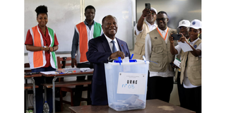 Ivory Coast's President Alassane Ouattara, who is seeking a fourth term, votes during the presidential election at a polling station at the Lycee Saint-Marie de Cocody in Abidjan, Ivory Coast, October 25, 2025.