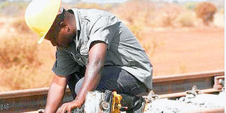 A construction worker at the trial section of the Standard Gauge Railway at Mtito Andei. The project employees downed their tools on February over a fuel rationing dispute with a Chinese company running the project. PHOTO | NMG