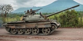 A Congolese army tank heads towards the front line near Kibumba in the area surrounding the North Kivu city of Goma during clashes between the Congolese army and M23 rebels, May 25, 2022. PHOTO | COURTESY