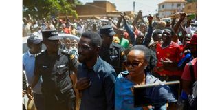 Ugandan Presidential candidate Robert Kyagulanyi, also known as Bobi Wine, of the National Unity Platform (NUP) party, flanked by his wife Barbara Kyagulanyi are escorted by police and supporters as they arrive to cast their votes in the general election, within Magere neighborhood of Kasangati district in Kampala, Uganda January 15, 2026.