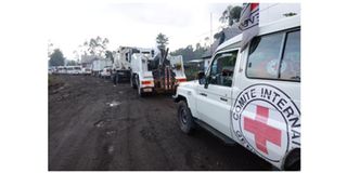 An International Committee of the Red Cross convoy escorts the now-unarmed Congolese soldiers and police officers, as well as their families who sought refuge at the United Nations Organization Stabilization Mission in the Democratic Republic of the Congo (MONUSCO) base since the capture by M23 rebels in January; in Goma, North Kivu province of the Democratic Republic of Congo, April 30, 2025.