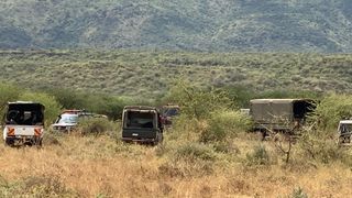 KDF personnel cordon off the scene of the military helicopter crash in Oltepesi, Kajiado West on June 24, 2021. Ten Kenya Air Force soldiers died in the crash. PHOTO | VINCENT ACHUKA | NMG