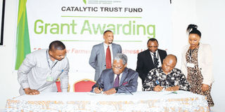 The Southern Agricultural Growth Corridor of Tanzania’s Catalytic Trust Fund (CTF) board chairman Ami Mpumbwe (seated left) and Movek Development Solutions director Kefao Mugittu sign documents during a grant awarding ceremony in Dar es Salaam yesterday. Looking on are Industry, Trade and Investment deputy permanent secretary Joel Malongo (standing left) and CTF executive secretary John Kyaruzi. PHOTO|COURTESY OF SAGCOT