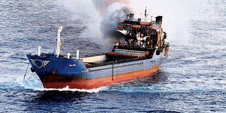 The MV Gold Star burns after its crew set it on fire following its interception by Italian police and customs officials in the Mediterranean Sea on Saturday. The Tanzanian-registered ship was carrying drugs valued at Sh125 billion.PHOTO | AFP