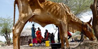 Members of the Lakaanki family from the Maasai pastoralist community gather near their emaciated cow at their manyatta homestead following worsening drought due to the failed rainy season at a village settlement near Magadi township along the Kenya-Tanzania border, in Kajiado, Kenya, February 5. PHOTO | REUTERS