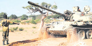 Soldiers use a tank on the battle front in Somalia. A UPDF senior officer is under investigation for allegedly having connections with a company that conned a polish firm of Shs2 billion in a fake arms deal company that could supply the army, among other equipment, 375 tanks specified as T-54, T-55, T-72, T-90s PHOTO | NMG