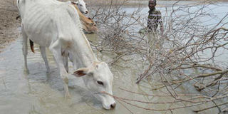 A herder watches as his cows drink water from one of the few remaining sources at Gedi Lun in Garissa. Devolution Cabinet Secretary Mwangi Kiunjuri has said that the national government has released Sh5 billion to fight drought. PHOTO |NATION MEDIA GROUP
