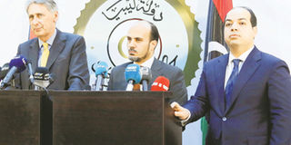 British Foreign Secretary Philip Hammond (L) attends a press conference with Ahmed Maiteeq (R), Libyan deputy prime minister of the Government of National Accord (GNA), and Mohammad al-Ammari (C), a member of the GNA, in Tripoli on April 18, 2016. PHOTO | AFP