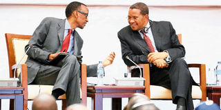 Rwandan president Paul Kagame shares a word with President Kikwete during a past meeting by the two leaders. Rwanda’s Green Party, the country’s tiny but main opposition, said Thursday it was challenging moves to change the constitution to allow strongman and President Paul Kagame to stand for a third consecutive term in elections in 2017. PHOTO|AFP