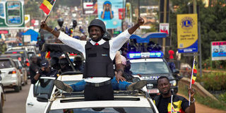 Ugandan presidential candidate Robert Kyagulanyi, also known as Bobi Wine, of the National Unity Platform (NUP), rides on a motorcade as he campaigns ahead of the general elections, in Kampala, Uganda, January 12, 2026. PHOTO/REUTERS