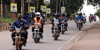 Motorcycle taxis ride past campaign posters of Uganda's President and leader of the ruling National Resistance Movement (NRM) party, Yoweri Museveni, ahead of the upcoming general election in Kampala, Uganda October 13, 2025. PHOTO | REUTERS