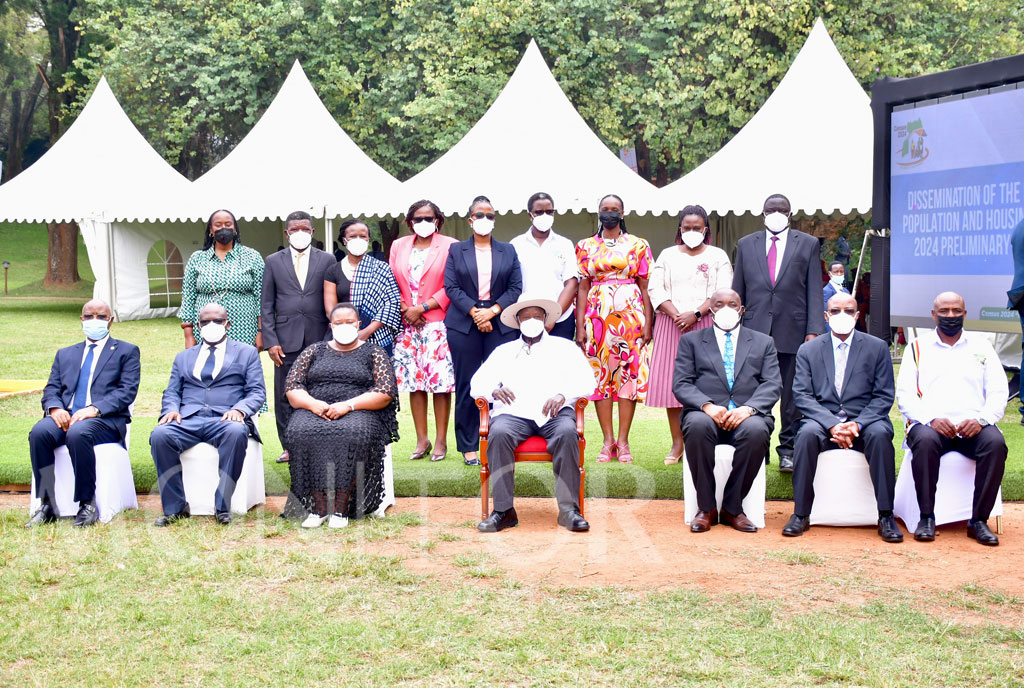 President Museveni poses for a photo with government and Ubos officials following the release of 2024 national census reuslts at Serena Hotel in Kampala on June 27, 2024. PHOTO/DAVID LUBOWA