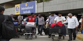 Passengers arrive at Jommo Kenyatta International Airport. Travellers from west African countries where Ebola has killed hundreds have devised ways of getting into Kenya through Busia and Malaba after being barred from entering the country through the airport. PHOTO | FILE