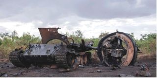 A destroyed military vehicle in Rugari after clashes between the Congolese army and M23 rebels in the east of the Democratic Republic of Congo. PHOTO | AFP