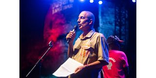 Sauti za Busara Festival director Yusuf Mahmoud addresses the audience on the opening night of the 2022 edition