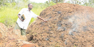 Mpiji Station village chairman Said Mwenyegoha shows journalists a charcoal kiln in his village. Charcoal burning is responsible for the destruction of vast tracts of prime forestry in Pwani and its environs. PHOTO | SYLIVESTER ERNEST