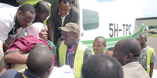 Natural Resources and Tourism deputy minister Lazaro Nyalandu (top, right) helps get a victim of last Sunday’s church blast, Ms Jennifer Joachim, into a plane in Arusha yesterday. Eight people who were injured in the attack were yesterday airlifted to Dar es Slaam for further treatment. PHOTO | mussa juma