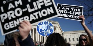 "Pro-life" activists try to block the sign of a counter-protester asking to "Keep abortion legal" during an annual march against the Supreme Court's 1973 decision to legalize abortion