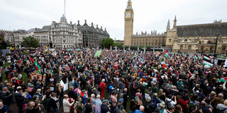 Demonstrators gather at the Parliament Square as they take part in a 'Trump Not Welcome' rally during the state visit of U.S. President Donald Trump and first lady Melania Trump, in London, Britain, September 17, 2025.PHOTO/ REUTERS