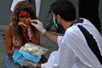 A wounded woman receives help outside a hospital following an explosion in the Lebanese capital Beirut on August 4, 2020. Photo | Afp