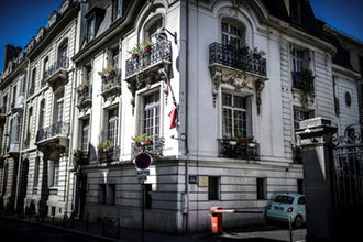 A picture taken on August 5, 2020 shows the Lebanese national flag flying at half-mast at the Lebanon embassy in Paris a day after a powerful explosion tore through Lebanon's capital, resulting from the ignition of a huge depot of ammonium nitrate at the city's main port. - The French President will travel to Beirut on August 6, 2020 to "meet all political actors" following the blasts that devastated the Lebanese capital. (Photo by STEPHANE DE SAKUTIN / AFP)