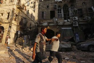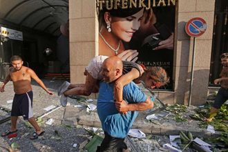 A wounded man is helped as he walks through debris in Beirut's Gemmayzeh district following a twin explosion at the port of Lebanon's capital on August 4, 2020. Photo | Marwan Tahtah | Afp