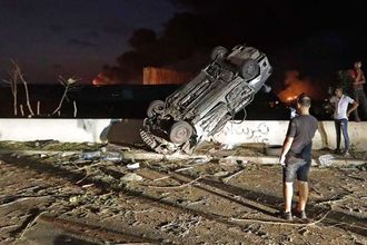 Flames engulf ships and vehicles at the port of Beirut following a massive explosion that hit the heart of the Lebanese capital on August 4, 2020. - Rescuers searched for survivors in Beirut on August 5 after a cataclysmic explosion at the port sowed devastation across entire neighbourhoods, killing more than 100 people, wounding thousands and plunging Lebanon deeper into crisis. (Photo by - / AFP)
