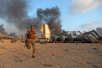 EDITORS NOTE: Graphic content / A Lebanese army soldier runs at the scene of an explosion at the port of Lebanon's capital Beirut on August 4, 2020. (Photo by STR / AFP)