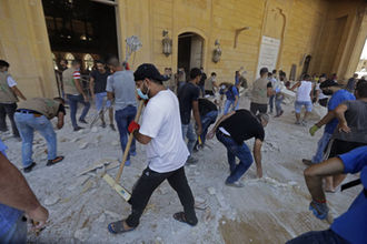 People clean debris at Mohammed al-Amin mosque in the centre of Beirut on August 5, 2020 in the aftermath of a massive explosion in the Lebanese capital. - Rescuers searched for survivors in Beirut after a cataclysmic explosion at the port sowed devastation across entire neighbourhoods, killing more than 100 people, wounding thousands and plunging Lebanon deeper into crisis. The blast, which appeared to have been caused by a fire igniting 2,750 tonnes of ammonium nitrate left unsecured in a warehouse, was felt as far away as Cyprus, some 150 miles (240 kilometres) to the northwest. (Photo by JOSEPH EID / AFP)