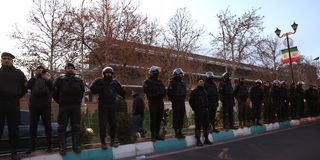 Members of the Iranian police stand guard at a protest in front of the British embassy following anti-government protests in Tehran, Iran, January 14, 2026. PHOTO | REUTERS