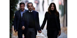 Former French President Nicolas Sarkozy leaves his house with his wife Carla Bruni-Sarkozy on the day of his incarceration at the Sante prison to begin his five-year prison sentence for criminal conspiracy over attempts to raise campaign funds from Libya, in Paris, France, October 21, 2025.PHOTO/ REUTERS