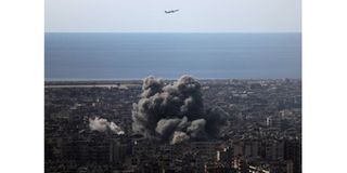 An airplane flies as smoke rises after an Israeli strike on Beirut's southern suburbs, following an escalation between Hezbollah and Israel amid the US-Israeli conflict with Iran, Lebanon, March 6, 2026.