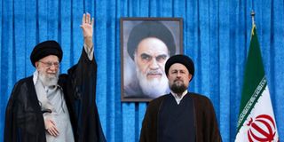 Ayatollah Ruhollah Khomeini's grandson, Hassan Khomeini stands next to Iran's Supreme Leader Ayatollah Ali Khamenei during the 36th anniversary of the death of the leader of Iran's 1979 Islamic Revolution, Ayatollah Ruhollah Khomeini, at Khomeini's shrine in southern Tehran, Iran June 4, 2025. PHOTO | REUTERS