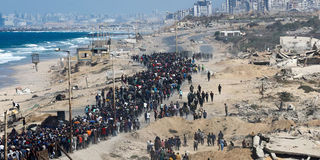 Palestinians, who were displaced to the southern part of Gaza at Israel's order during the war, walk along a road as they attempt to return to the north after a ceasefire between Israel and Hamas in Gaza went into effect, in the central Gaza Strip, October 10, 2025.PHOTO/ REUTERS
