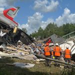 Specialists of emergency services gather near a destroyed carriage at the scene, after a road bridge collapsed onto railway tracks derailing an approaching train in the Bryansk region, Russia, June 1, 2025. PHLOTO/REUTERS/Stringer