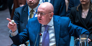 Russia's Ambassador to the United Nations Vasily Nebensya speaks to delegates after voting against a U.S. ceasefire resolution for the Gaza war during a UN Security Council meeting at the United Nations headquarters on March 22, 2024 in New York City. PHOTO | AFP