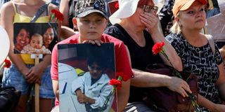 Local people hold portraits of lost passengers during a mourning ceremony at the MH17 crash site on the seventh anniversary of the disaster near the separatist-controlled village of Hrabove on July 17.