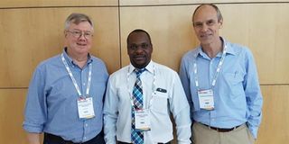 (from left to right) Magnus von Knebel Doeberitz, Medical Director, Department of Applied Tumor Biology, Institute of Pathology,Heidelberg University Hospital; Elkanah Omenge Orang'o of Moi University, Nairobi; and Hermann Bussmann, Research Associate, Department of Immunology and Infectious Diseases, Harvard T.H. Chan School of Public Health.
