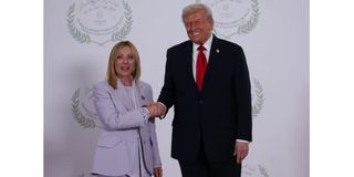 US President Donald Trump and Italian Prime Minister Giorgia Meloni shake hands as they pose for a photo, at a world leaders' summit on ending the Gaza war, amid a US-brokered prisoner-hostage swap and ceasefire deal between Israel and Hamas, in Sharm el-Sheikh, Egypt, October 13, 2025.
