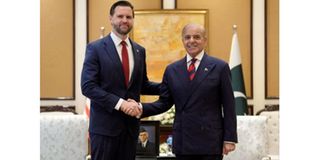 US Vice President JD Vance and Pakistan's Prime Minister Shehbaz Sharif pose on the day of a meeting for talks about Iran, in Islamabad, Pakistan, April 11, 2026.